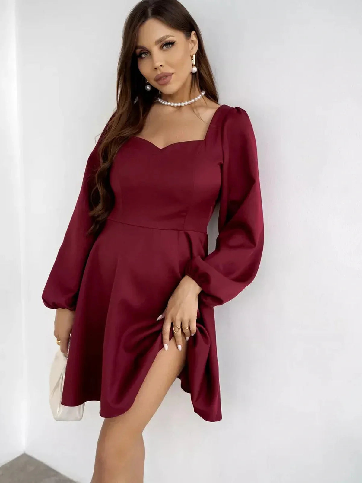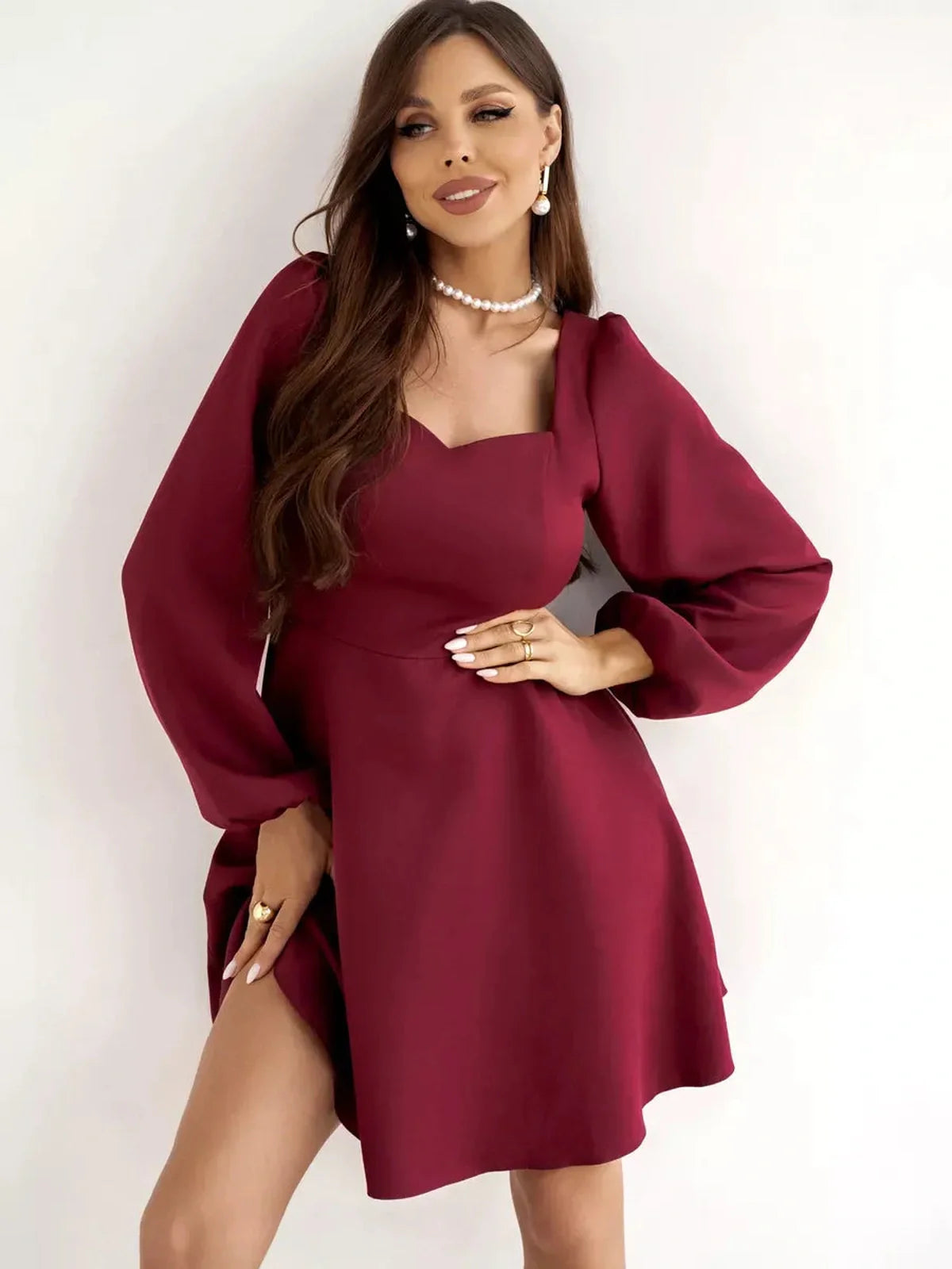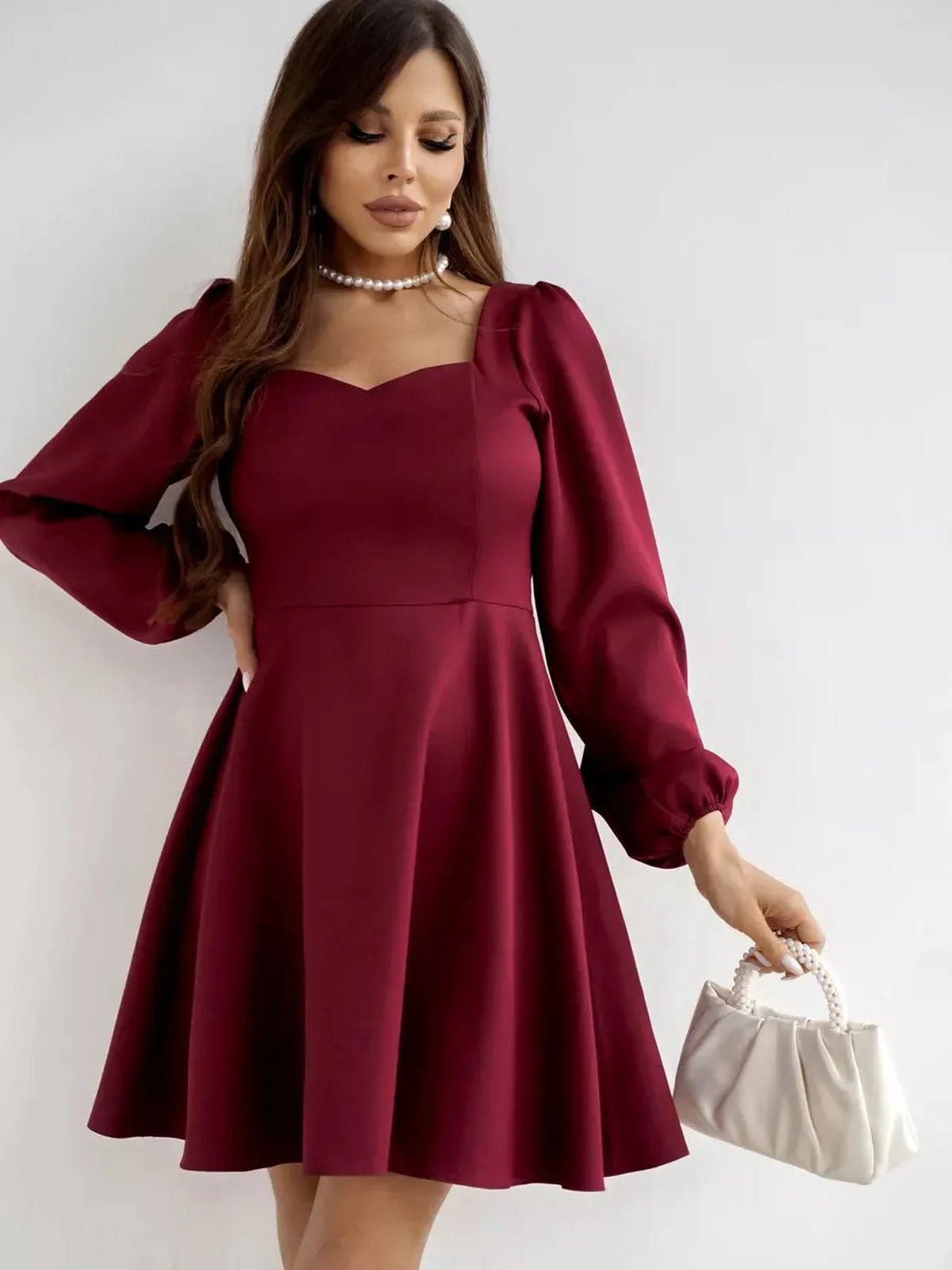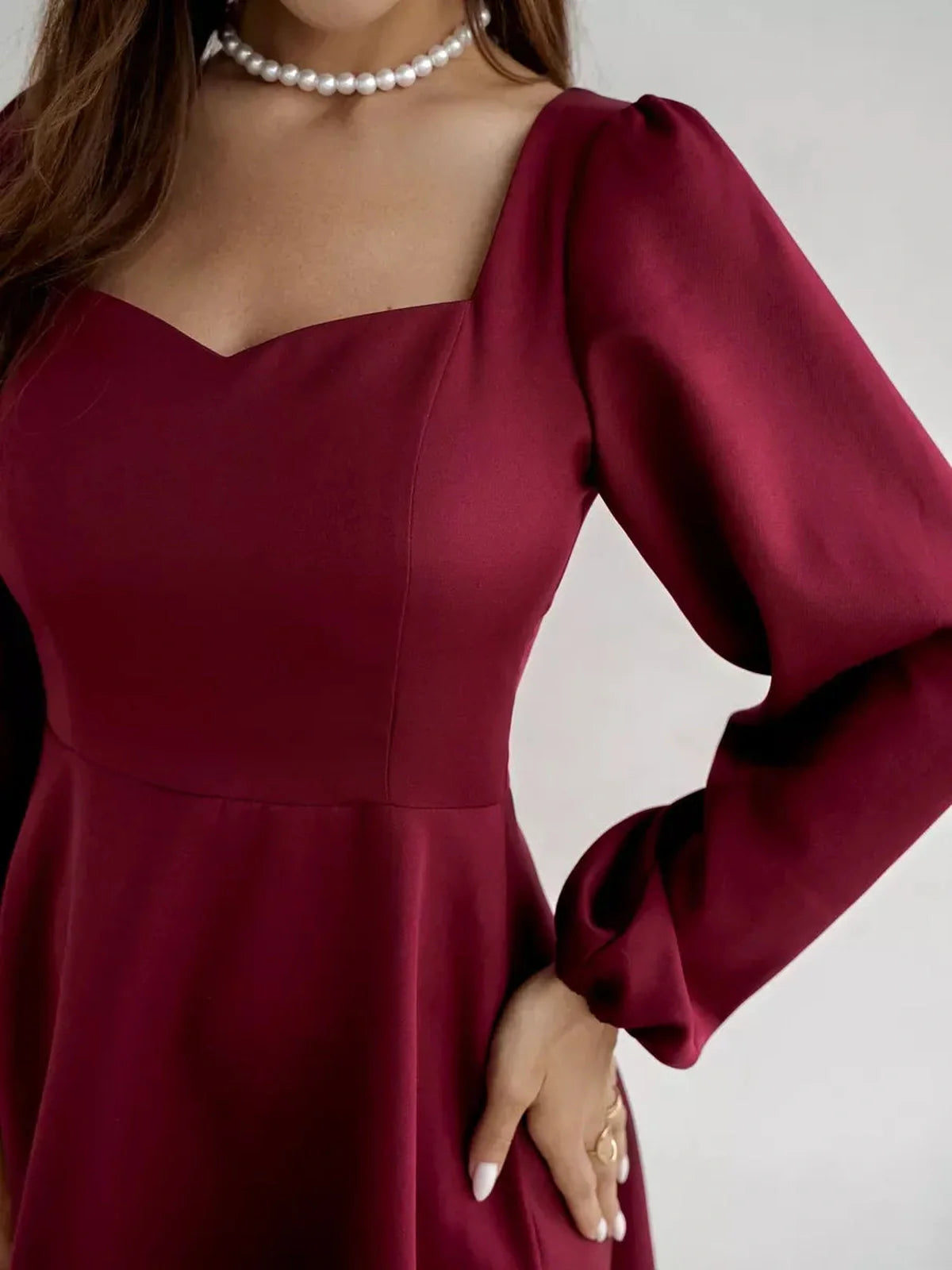 The square neckline with a soft sweetheart curve frames the décolleté with feminine grace, while the gathered shoulders and voluminous long sleeves create balance and refinement. The fitted waist transitions into a flared A-line skirt, offering a flattering silhouette that enhances natural curves without feeling restrictive. Finished with a hidden back zipper for a seamless fit, the Velvet Bloom is as practical as it is stunning.