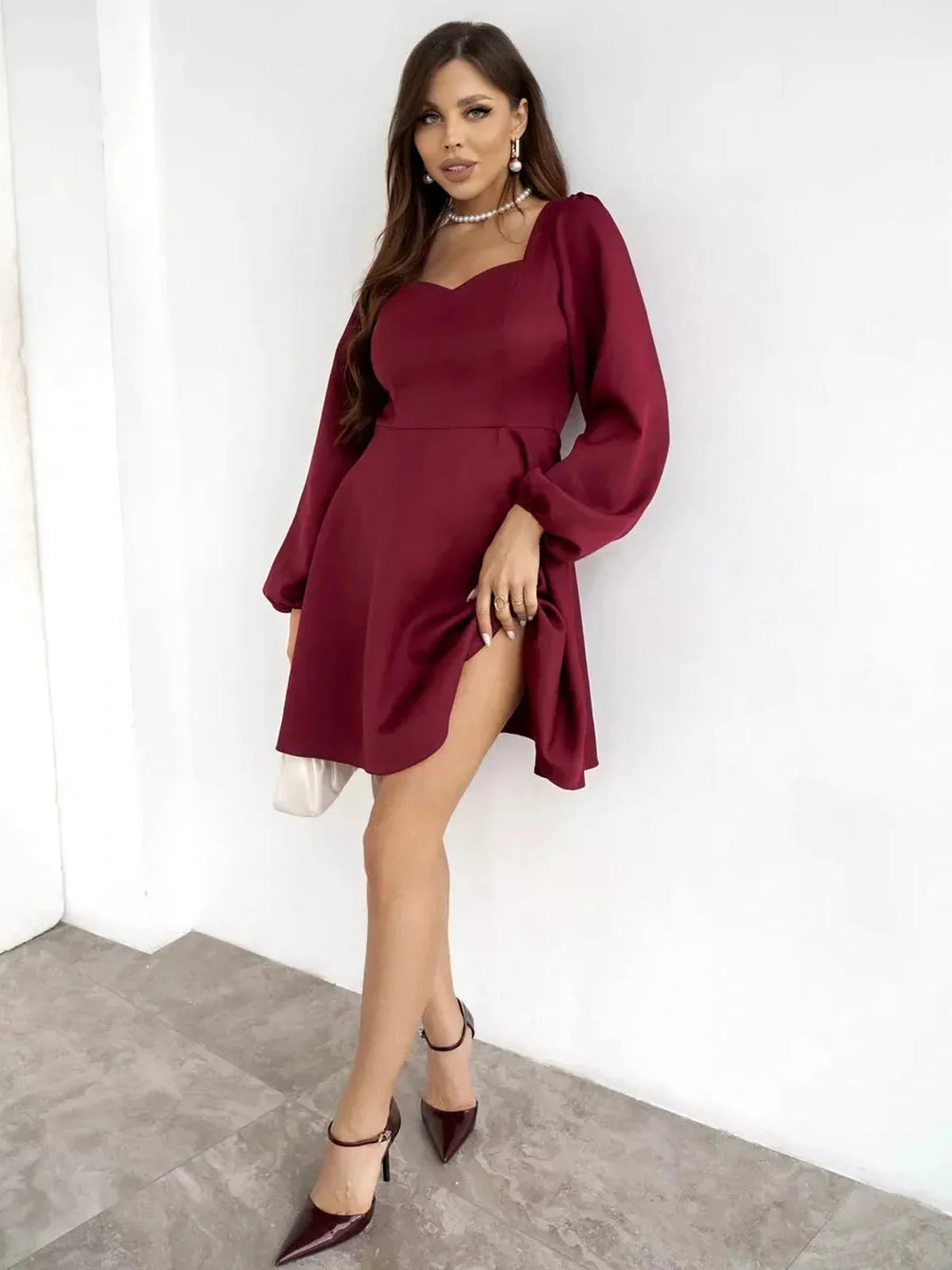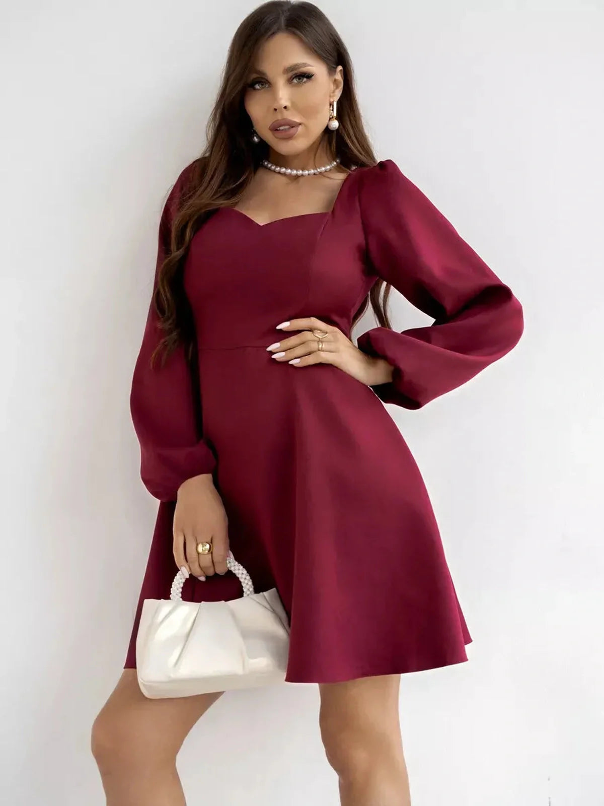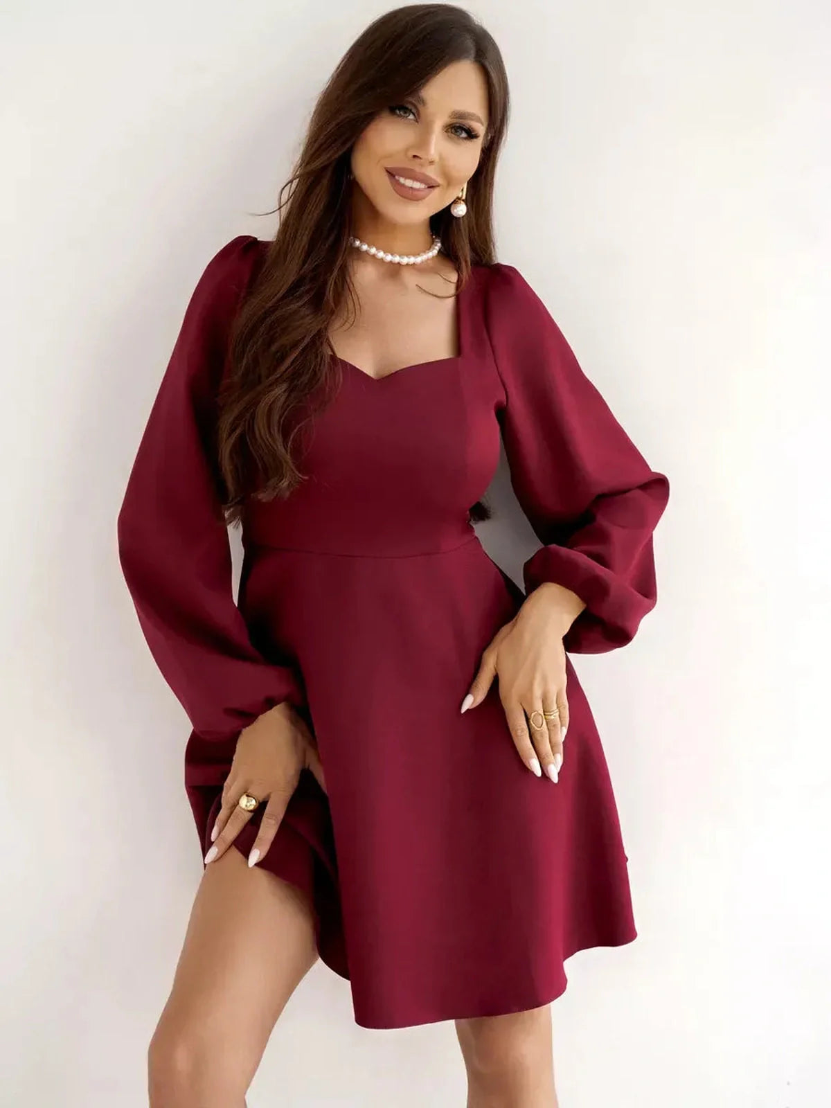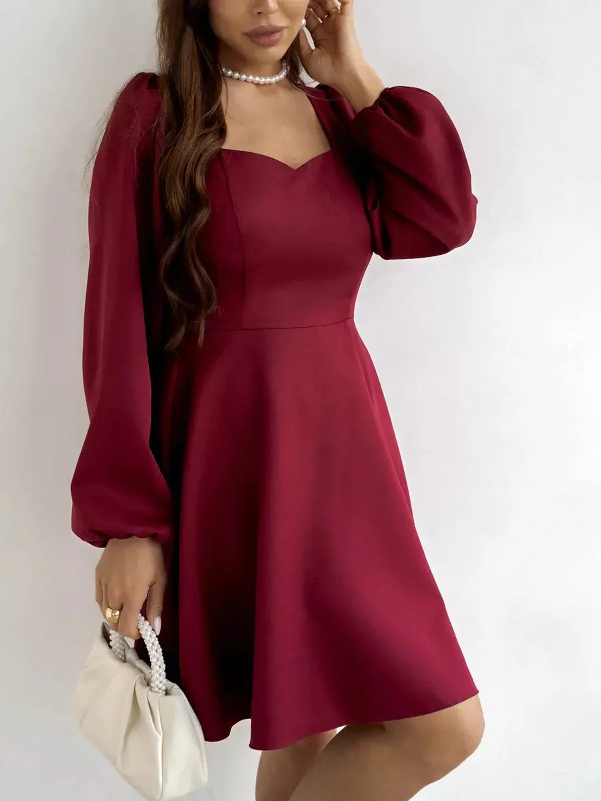 The square neckline with a soft sweetheart curve frames the décolleté with feminine grace, while the gathered shoulders and voluminous long sleeves create balance and refinement. The fitted waist transitions into a flared A-line skirt, offering a flattering silhouette that enhances natural curves without feeling restrictive. Finished with a hidden back zipper for a seamless fit, the Velvet Bloom is as practical as it is stunning.