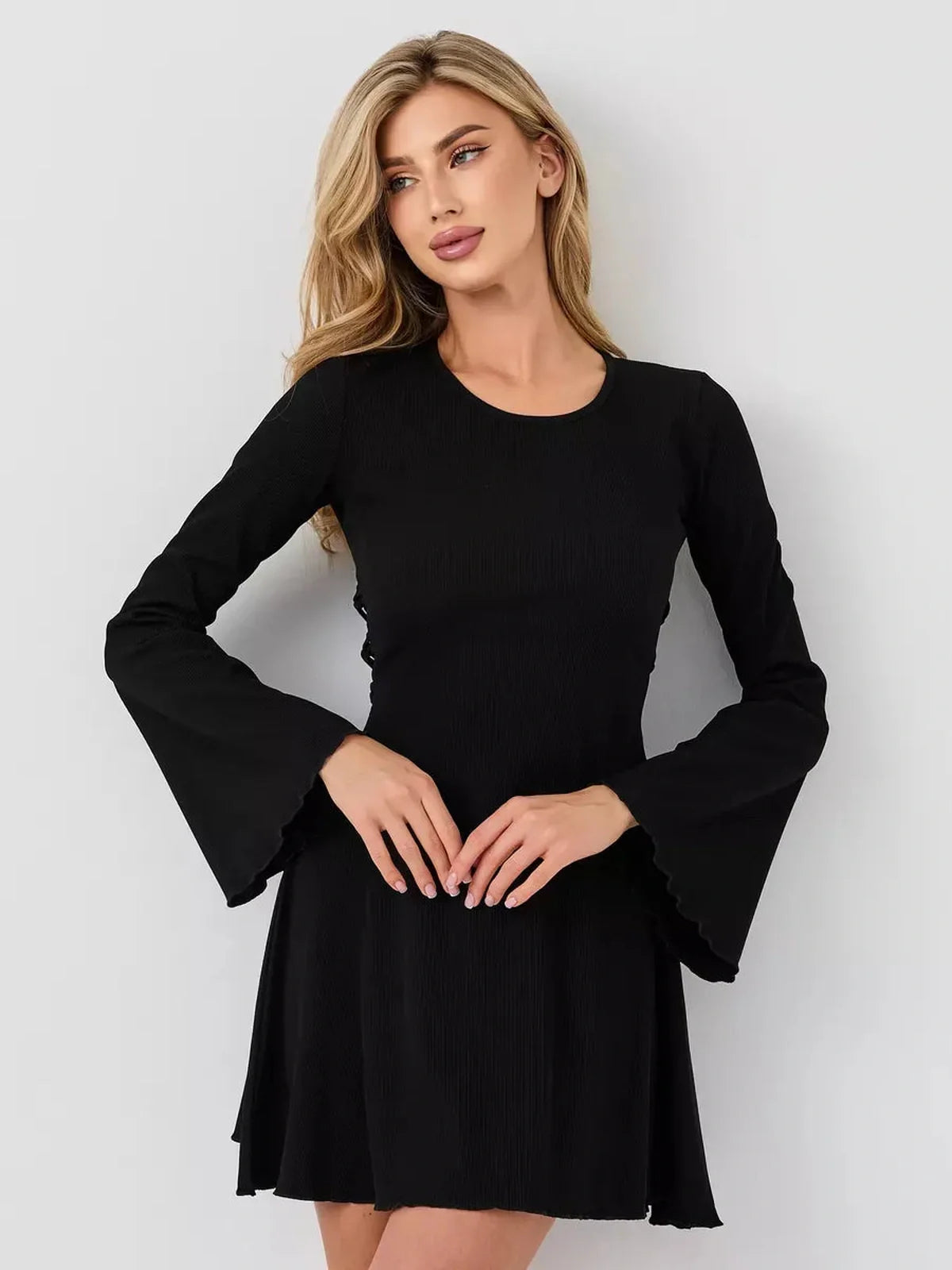 The structured U-neckline frames the décolletage with clean lines, while flared cuffs add a hint of vintage-inspired drama. The adjustable lace-up tie at the back offers a corset-style cinch, defining the waist and creating an elegant hourglass shape. Finished in a classic A-line cut with a fluid drape, this long sleeve dress radiates understated confidence — effortlessly transitioning from daytime refinement to evening glamour.