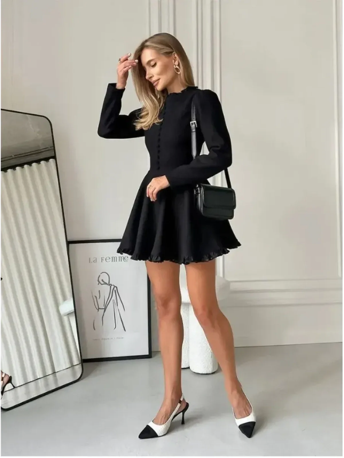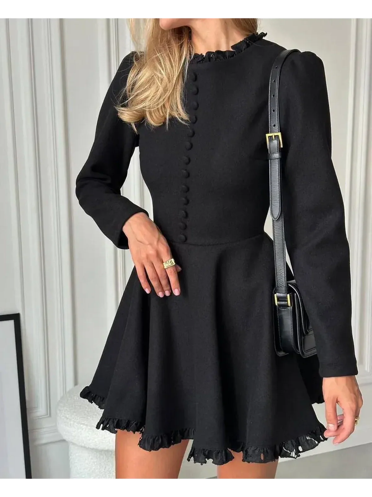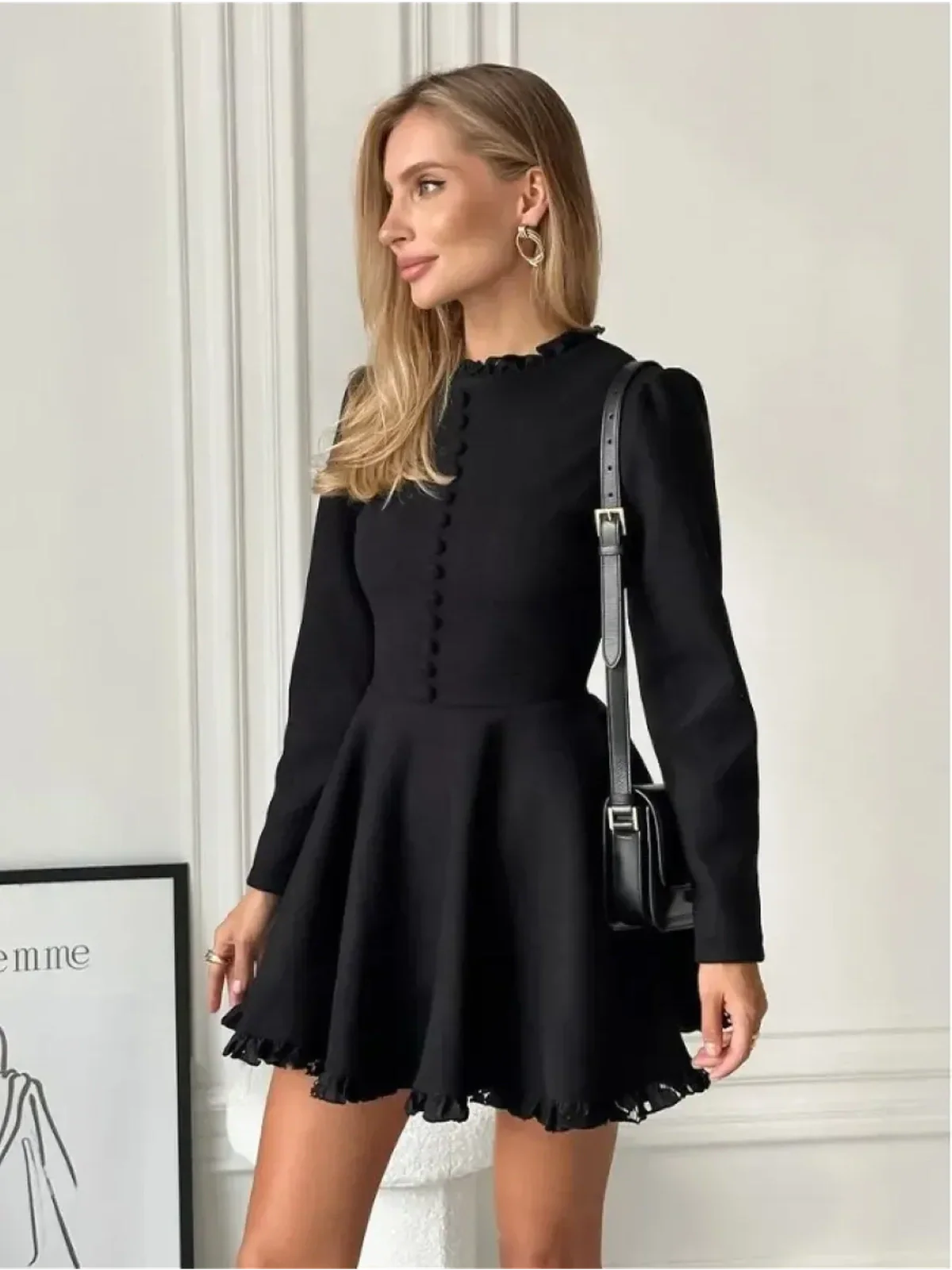 Step into the spotlight with the Astra Mini Dress, a refined fusion of structure and softness designed to make an unforgettable impression. This women’s long sleeve mini dress features a sculpted, form-fitting bodice with covered buttons and a delicately ruffled neckline, exuding modern sophistication and timeless poise.