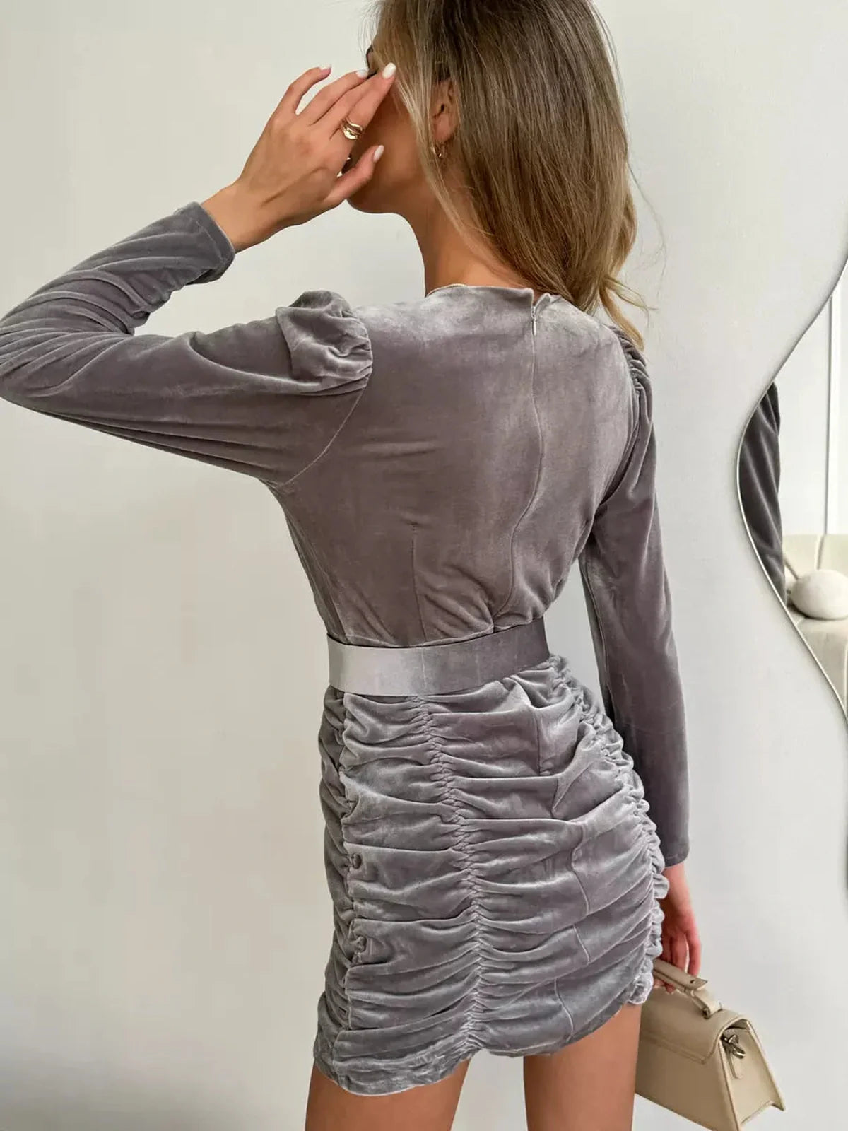 The V-neck wrap bodice frames the neckline beautifully, while puff shoulders and long sleeves add a touch of structured sophistication. A matching wide belt cinches the waist, enhancing the hourglass silhouette and bringing balance to the softly ruched mini skirt. Designed in a warm gray hue, the Velvet Rush Mini Dress offers a modern twist on timeless glamour — the perfect alternative to a classic black dress.